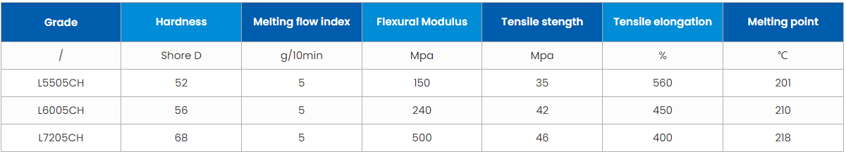 GradeHardnessMelting flow indexFlexural ModulusTensile stengthTensile elongationMelting point
